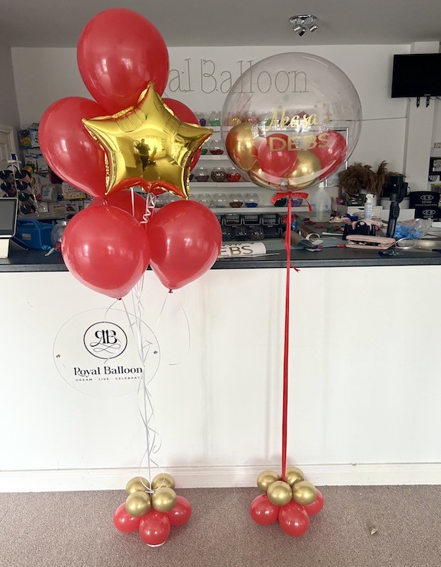 Featuring one bouquet of helium balloons with 6 premium latex balloons and one sparkling 18" star foil balloon. A bespoke clear bobo balloon, all perfectly arranged.