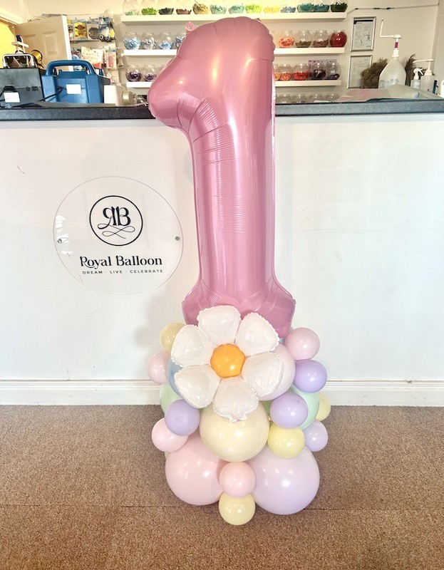 Celebrate your little one's first birthday with a charming Balloon Stack Number Display! This adorable balloon arrangement features a big number '1', beautifully designed with a daisy flower accent, adding a sweet and playful touch. Available in any color combination to match your theme, this stylish display is perfect for photos, party décor, and milestone celebrations. Ideal for both indoor and outdoor setups, our first birthday balloon stack creates a picture-perfect moment for your special day!