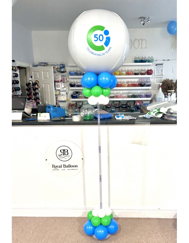 Stunning bespoke 32-inch white ORB balloon on a stand created by Royal Balloon for a corporate event.
